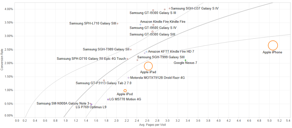 Door te kijken naar attributen waarop je kan targetten, kun je data van eerdere SEA-campagnes gebruiken. Zoals welke apparaten het beste engagement opleveren. Zie onderstaande overzicht van conversiepercentages en gemiddeld aantal pagina’s per bezoek. De omvang van het verkeer per mobiel apparaat wordt met de grootte van de cirkel aangegeven. Apple scoort dus goed op engagement en hoeveelheid verkeer. Kijk je naar de conversie, dan doet Samsung het duidelijk beter.