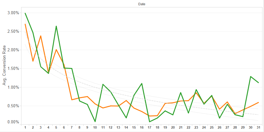 (Analyse per dag van de maand over 12 maanden van PPC (groen) en SEO (oranje) gegevens voor dezelfde landingspagina.)