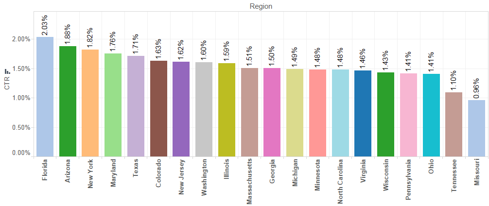 Regionale consumenteninzichten kunnen een grote aanwinst zijn voor merken. Deze grafiek toont de CTR gegroepeerd per Amerikaanse staat, en je ziet duidelijke verschillen. In dit voorbeeld werd bij sommige gevallen vastgesteld dat de CTR gerelateerd was aan de achtergrond van de Google Ads-marketeer. In andere gevallen bleek het verschil in CTR een weerspiegeling te zijn van de regionale naamsbekendheid: branding ondersteunt SEA. Met dit soort bevindingen kun de naamsbekendheid in bepaalde regio’s vergroten. Maak een nulmeting en meet vervolgens de resultaten van de campagne.