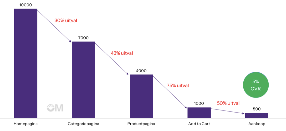 De conversieratio komt in dit voorbeeld uit op 5%. Dat is voor veel e-commerce websites een sterke prestatie. Logischerwijs ga je optimaliseren waar de hoogste uitval is, namelijk de add to carts en aankopen. Dit betekent echter niet dat je de eerdere stappen helemaal niet moet optimaliseren, je wil natuurlijk dat de hele customer journey verbeterd.