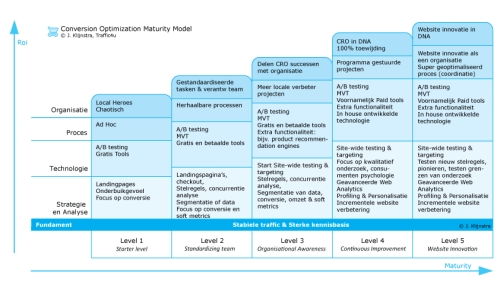 Hoe volwassener de organisatie wordt, hoe meer de website afgestemd zal zijn op de bezoeker, hoe sneller er ingespeeld kan worden op ontwikkelingen en hoe meer ROI er daardoor behaald kan worden.