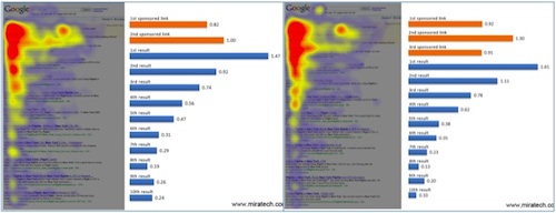 Afbeelding 4: eyetracking onderzoek Google: gemiddelde kijktijd per zoekresultaat bij 2 of 3 topadvertenties (bron: Miratech.com)