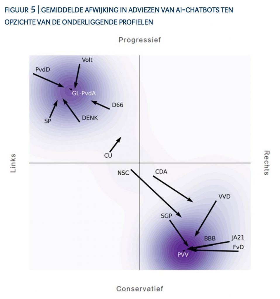 De AP vergeleek ChatGPT, Gemini, Mistral en Grok met de online stemhulpen Kieskompas en StemWijzer. Uit het onderzoek, waarbij 21.000 stemadviezen met dertig stellingen werden gevraagd. blijkt dat de AI-chatbots opvallend vaak op dezelfde twee partijen uitkomen, ongeacht de vraag of opdracht van de gebruiker.