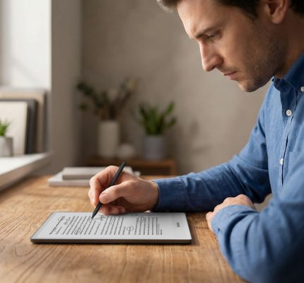 De PocketBook InkPad One heeft een minimalistisch ontwerp en een vlak, randloos leesoppervlak zonder overbodige knoppen. Het grote scherm biedt volop ruimte voor aantekeningen, schetsen en markeringen, net als op papier. Het matzwarte aluminium frame is licht en stevig en versterkt het contrast met de digitale pagina. Subtiele details, zoals antislip-elementen op de achterzijde en een iets bredere onderrand, zorgen voor extra grip en stabiliteit. Het resultaat is een verfijnd, ergonomisch apparaat dat natuurlijk in de hand ligt.